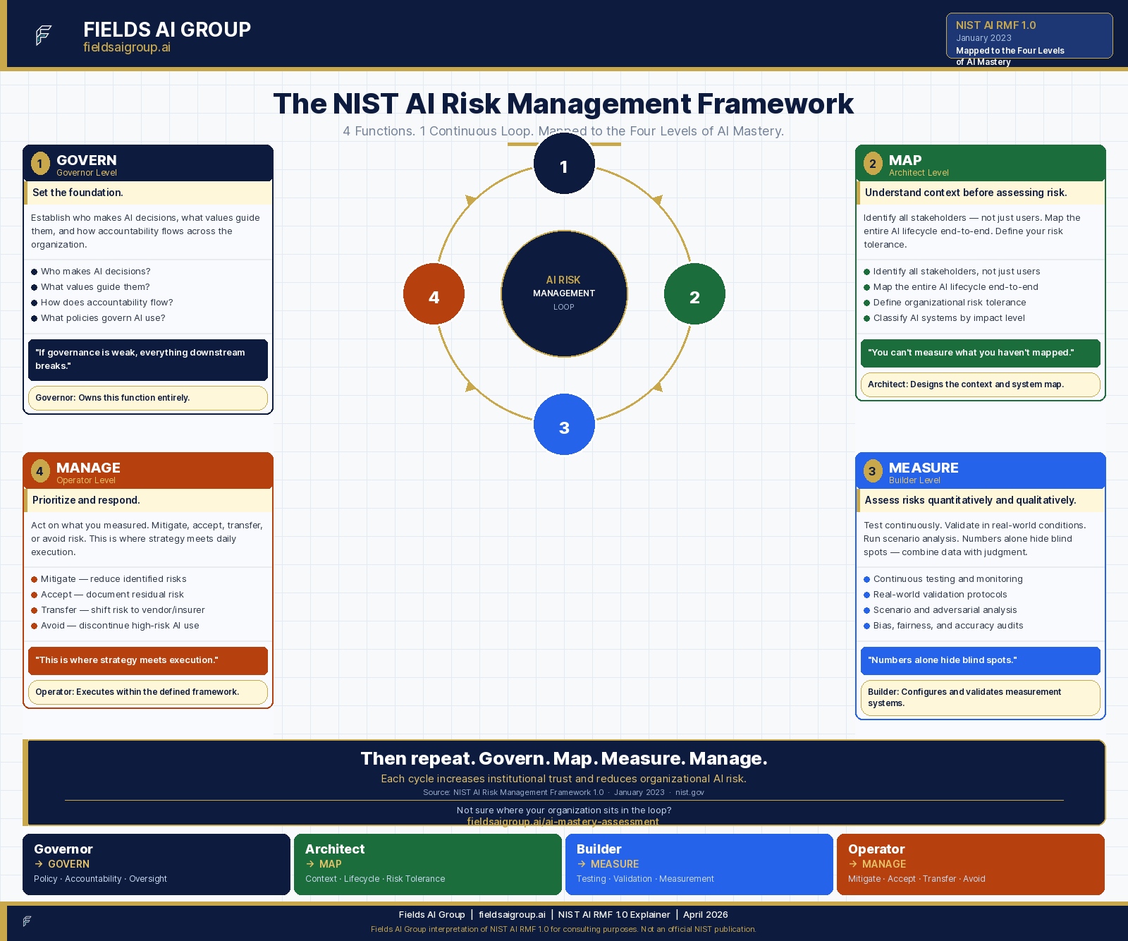 4 functions. 1 loop. The global standard for managing AI risk — mapped to the Four Levels of AI Mastery.